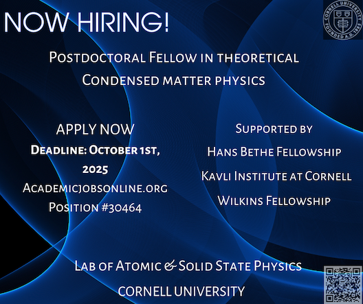 The Bethe/KIC and the Wilkins/KIC Theory Fellowships are high-profile postdoctoral positions with significant independence and resources. This prize fellowship is designed to attract the best and brightest theoretical physicists within 3 years of their PhD to work with theorists and experimentalists in Cornell's Physics department, and in the larger Cornell community. Our theorist group has broad interests in hard and soft condensed matter physics, including (but not limited to): biophysics, cold atom physics, electronic structure theory, hydrodynamics, machine learning, materials science, statistical physics, strongly correlated electrons, quantum information.